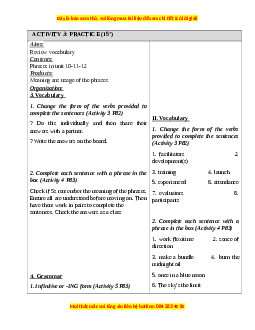 - Develop ss' skills of doing some exercises to consolidate and apply what they have learnt in Unit 10-12 Attitute: Ss work hard 3. Competence: