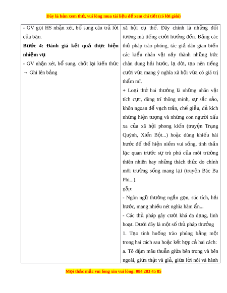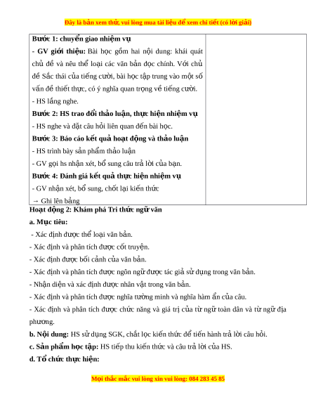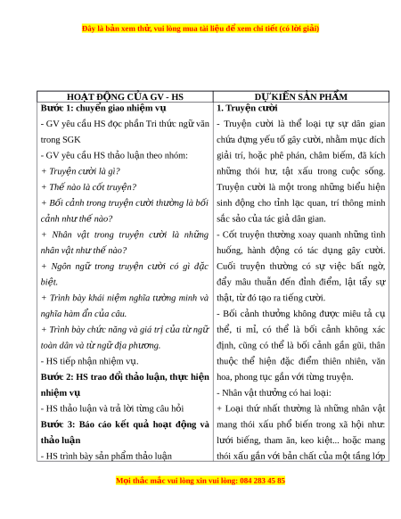 Đây là bản xem th , vu ử i lòng mua tài li u ệ đ xe ể m chi ti t ế (có l i ờ gi i ả ) HOẠT Đ N Ộ G C A Ủ GV - HS D K Ự IẾN SẢN PHẨM Bư c ớ 1: chuy n gi ể ao nhi m ệ vụ 1. Truy n c ệ ư i ờ - GV yêu c u ầ HS đ c ọ ph n ầ Tri th c ứ ng ữ văn - Truy n ệ cư i ờ là thể lo i ạ tư sư dân gian trong SGK ch a ứ đ ng ư y u ế tố gây cư i ờ , nh m ằ m c ụ đích - GV yêu c u H ầ S th o ả lu n t ậ heo nhóm: gi i ả trí, ho c ặ phê phán, châm bi m ế , đã kích + Truyện cư i ờ là gì? nh ng ữ thói h , ư t t ậ x u ấ trong cu c ộ s ng. ố + Th nào l ế à c t ố truy n? ệ Truyện cư i ờ là m t ộ trong nh ng ữ bi u ể hi n ệ + B i ố c nh ả trong truy n ệ cư i ờ thư ng ờ là b i ố sinh đ ng ộ cho t nh ỉ l c ạ quan, trí thông minh c nh ả nh t ư h nào? ế s c ắ s o ả c a ủ tác giả dân gian. + Nhân v t ậ trong truy n ệ cư i ờ là nh ng ữ - Cốt truy n ệ thư ng ờ xoay quanh nh ng ữ tình nhân v t ậ nh t ư h nào? ế huống, hành đ ng ộ có tác d ng ụ gây cư i ờ .