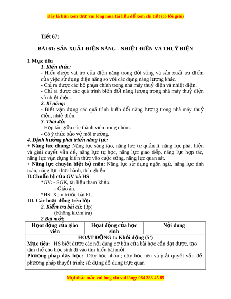 Đây là bản xem th , vu ử i lòng mua tài li u ệ đ xe ể m chi ti t (c ế ó l i ờ gi i ả ) Ti t ế 67: BÀI 61: SẢN XU T Ấ ĐI N Ệ NĂNG - NHI T Ệ ĐI N Ệ VÀ THU Đ Ỷ I N Ệ I. M c t ụ iêu 1. Ki n ế th c: ứ - Hi u ể đư c ợ vai trò c a ủ đi n ệ năng trong đ i ờ s ng ố và s n ả xu t ấ u ư đi m ể c a ủ việc s d ử ng ụ điện năng so v i ớ các d ng năng l ạ ư ng ợ khác. - Ch r ỉ a đư c các ợ b ph ộ n