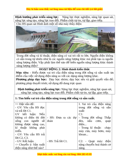 ự Năng l c ự th c ự nghi m ệ , năng l c ự quan sát, năng l c ự sáng t o, ạ năng l c t ự rao đ i ổ . Ph m ẩ ch t ấ t t ự in, t l ự p, gi ậ ao ti p. ế Cho HS quan sát Hình nh ả m t ộ s nhà m ố áy th y đi ủ n: ệ Trong đ i ờ s ng ố và kĩ thu t ậ , đi n ệ năng có vai trò r t ấ to l n. ớ Ngu n ồ đi n ệ không có s n