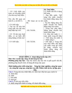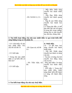 ệ và quá trình bi n ế đ i ổ năng lư ng t ợ rong các b ph ộ n đó. ậ - GV: Gi i ớ thi u ệ về nhà II. Nhi t ệ đi n. ệ máy nhi t ệ đi n. ệ Yêu C4: - Lò đ t ố than: hoá cầu HS tr l ả i ờ C4. - HS: Quan sát, tr l ả i ờ năng chuy n ể hoá thành C4. nhiệt năng. - Nồi h i ơ : Nhi t ệ năng - GV: K t ế lu n ậ chuy n ể hoá thành cơ năng c a ủ h i ơ . ? Trong nhà máy nhi t ệ - Tua bin: c ơ năng c a ủ h i ơ điện có sự bi n ế đ i ổ cơ chuy n ể hoá đ ng ộ năng b n ả nào? c a ủ tua bin. - HS: Th o ả lu n, ậ trả - Máy phát đi n: ệ Cơ năng l i ờ . chuy n ể hoá thành đi n ệ - GV: K t ế lu n. ậ năng. - K t ế lu n ậ 1: Trong nhà máy nhi t ệ đi n, ệ nhi t ệ năng đư c ợ bi n ế đ i ổ thành cơ năng, r i ồ thành đi n ệ năng. 3: Tìm hi u ho ể t ạ đ ng c ộ a nhà m ủ áy thu đi ỷ n. ệ M i ọ thắc m c