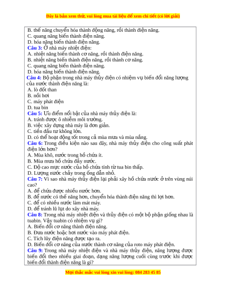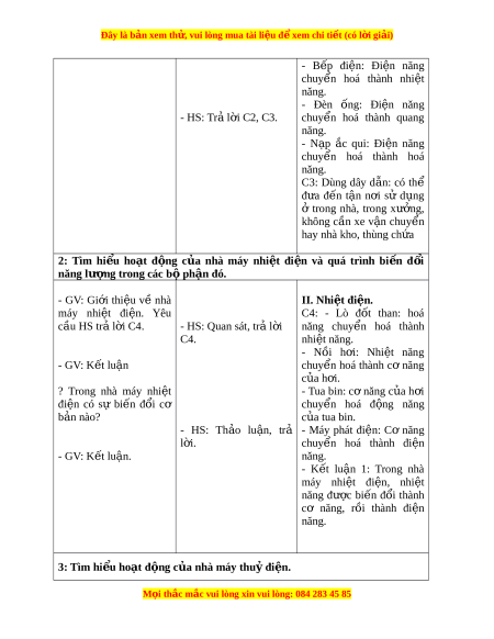 Đây là bản xem th , vu ử i lòng mua tài li u ệ đ xe ể m chi ti t (c ế ó l i ờ gi i ả ) - B p ế đi n: ệ Đi n ệ năng chuy n ể hoá thành nhi t ệ năng. - Đèn ng: ố Đi n ệ năng - HS: Tr l ả i ờ C2, C3. chuy n ể hoá thành quang năng. - N p ạ ắc qui: Đi n ệ năng chuy n ể hoá thành hoá năng. C3: Dùng dây d n: ẫ có thể đ a ư đ n ế t n ậ n i ơ sử d ng ụ ở trong nhà, trong xư ng, ở không c n ầ xe v n ậ chuy n ể hay nhà kho, thùng ch a ứ 2: Tìm hi u ể ho t ạ đ ng ộ c a ủ nhà máy nhi t ệ đi n