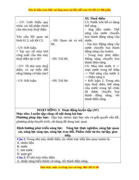 Đây là bản xem th , vu ử i lòng mua tài li u ệ đ xe ể m chi ti t (c ế ó l i ờ gi i ả ) III. Thuỷ đi n. ệ - GV: Gi i ớ thi u ệ quy C5: Nư c ớ trên h ồ có d ng ạ trình, các bộ ph n ậ chính th năng. ế c a ủ nhà máy thu đi ỷ n. ệ - ống d n ẫ nư c: ớ Thế năng c a ủ nư c ớ chuy n ể Yêu c u ầ HS quan sát hoá thành đ ng ộ năng c a ủ hình 61.2, tr l ả i ờ C5.