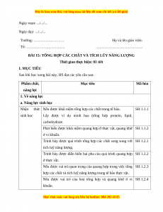 Giáo án Sinh học 10 Bài 15 (Chân trời sáng tạo): Tổng hợp các chất và tích lũy năng lượng