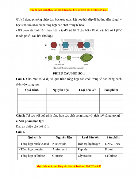 Câu 1. Cho một số ví dụ về quá trình tổng hợp các chất trong tế bào bằng cách điền vào bảng sau: Quá trình Nguyên liệu Loại liên kết Sản phẩm