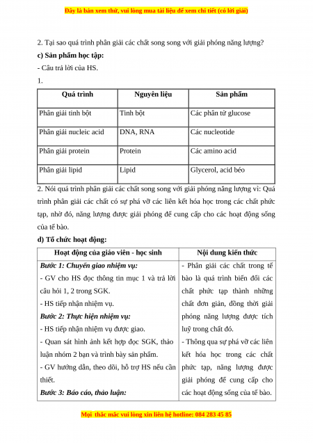 c) Sản phẩm học tập: - Câu trả lời của HS. 1. Quá trình Nguyên liệu Sản phẩm Phân giải tinh bột Tinh bột Các phân tử glucose Phân giải nucleic acid DNA, RNA Các nucleotide Phân giải protein Protein Các amino acid Phân giải lipid Lipid Glycerol, acid béo