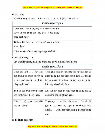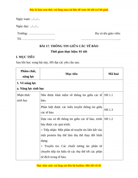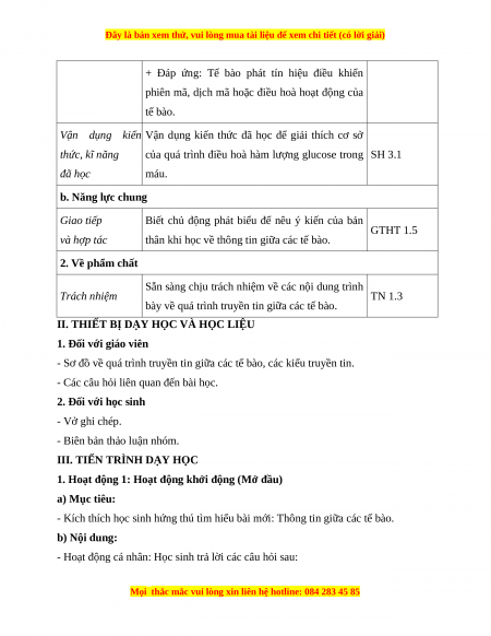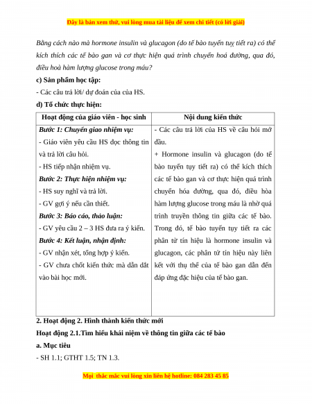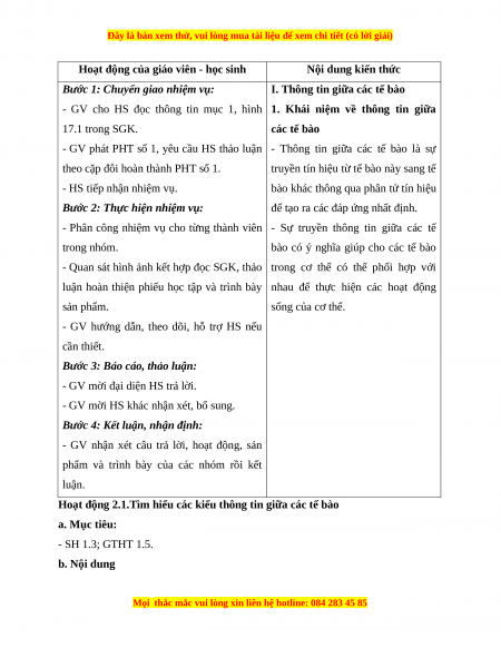 Hoạt động 2.1.Tìm hiểu khái niệm về thông tin giữa các tế bào a. Mục tiêu - SH 1.1; GTHT 1.5; TN 1.3.