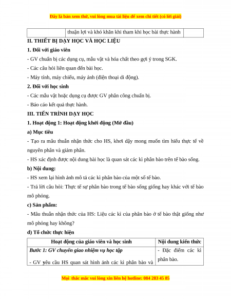 - HS xác định được nội dung bài học là quan sát các kì phân bào trên tế bào sống.
