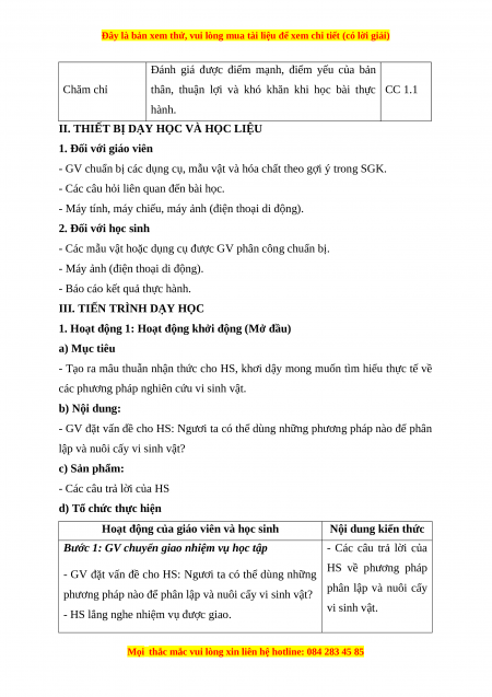 - GV chuẩn bị các dụng cụ, mẫu vật và hóa chất theo gợi ý trong SGK.