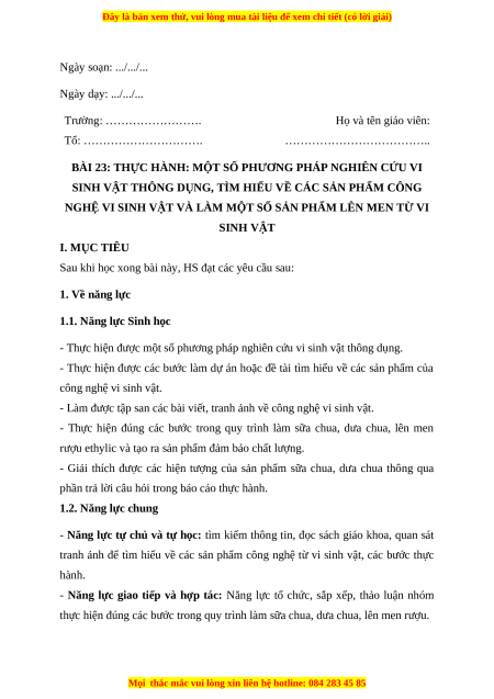 Giáo án Sinh học 10 Bài 23 (Kết nối tri thức): Thực hành một số phương pháp nghiên cứu vi sinh vật...
