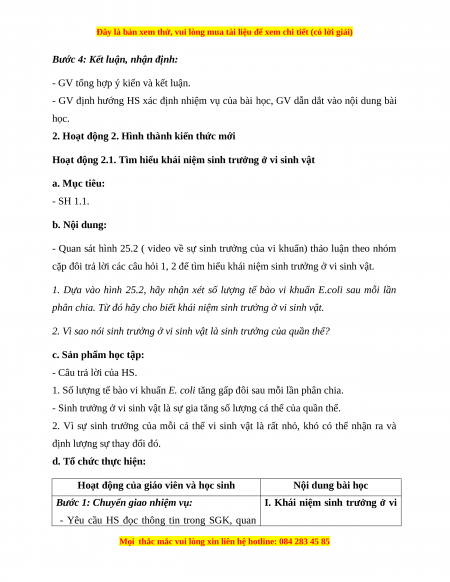 Giáo án Sinh học 10 Bài 25 (Chân trời sáng tạo): Sinh trưởng và sinh sản ở vi sinh vật