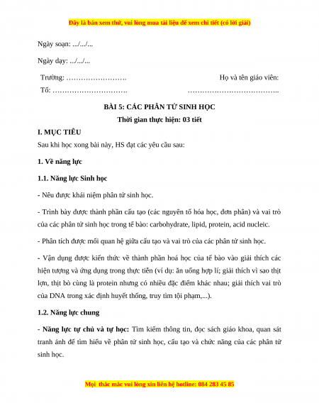 Giáo án Sinh học 10 Bài 5 (Kết nối tri thức): Các phân tử sinh học
