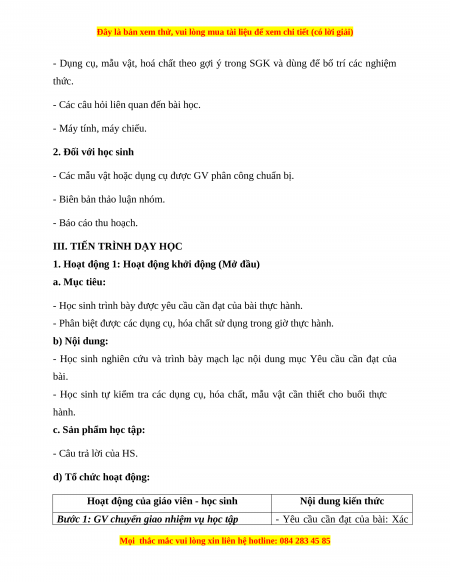- Phân biệt được các dụng cụ, hóa chất sử dụng trong giờ thực hành. b) Nội dung: