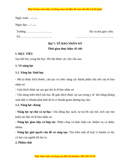 Giáo án Sinh học 10 Bài 7 (Kết nối tri thức): Tế bào nhân sơ