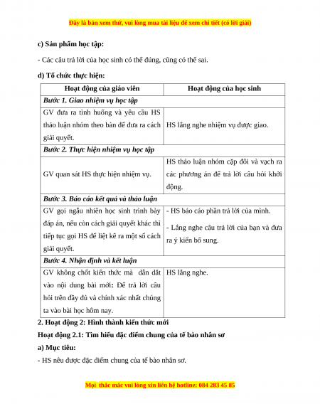 Hoạt động 2.1: Tìm hiểu đặc điểm chung của tế bào nhân sơ a) Mục tiêu: