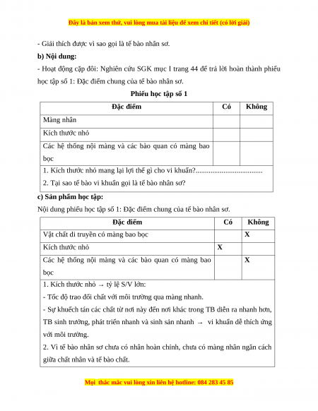 Nội dung phiếu học tập số 1: Đặc điểm chung của tế bào nhân sơ. Đặc điểm Có Không