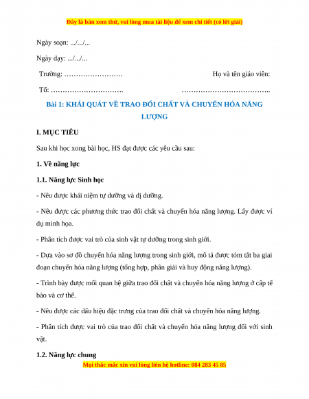 Bài 1: KHÁI QUÁT VỀ TRAO ĐỔI CHẤT VÀ CHUYỂN HÓA NĂNG LƯỢNG I. MỤC TIÊU