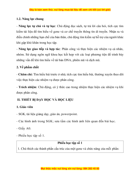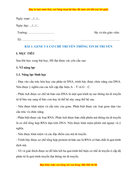 BÀI 1: GENE VÀ CƠ CHẾ TRUYỀN THÔNG TIN DI TRUYỀN I. MỤC TIÊU