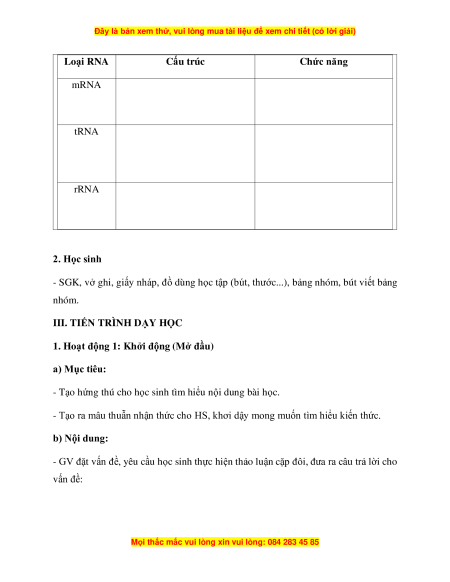 Loại RNA Cấu trúc Chức năng mRNA tRNA rRNA 2. Học sinh