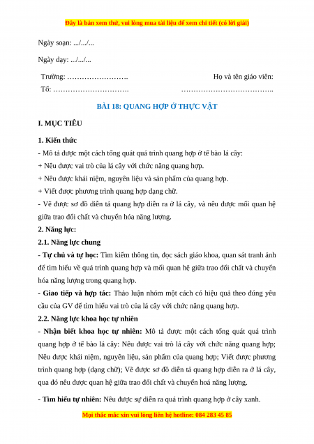 BÀI 18: QUANG HỢP Ở THỰC VẬT I. MỤC TIÊU 1. Kiến thức