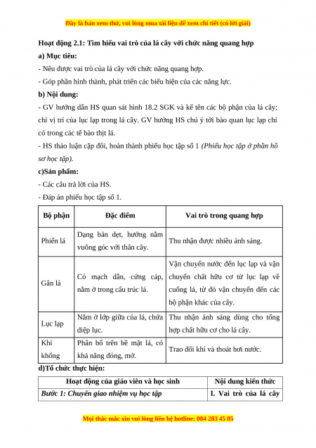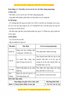 Hoạt động 2.1: Tìm hiểu vai trò của lá cây với chức năng quang hợp a) Mục tiêu: