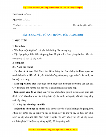 BÀI 19: CÁC YẾU TỐ ẢNH HƯỞNG ĐẾN QUANG HỢP I. MỤC TIÊU 1. Kiến thức