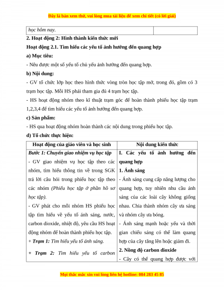 Hoạt động 2.1. Tìm hiểu các yếu tố ảnh hưởng đến quang hợp a) Mục tiêu: