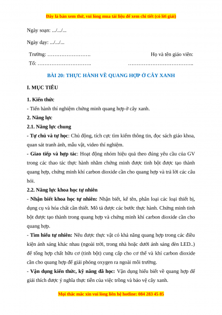 BÀI 20: THỰC HÀNH VỀ QUANG HỢP Ở CÂY XANH I. MỤC TIÊU 1. Kiến thức