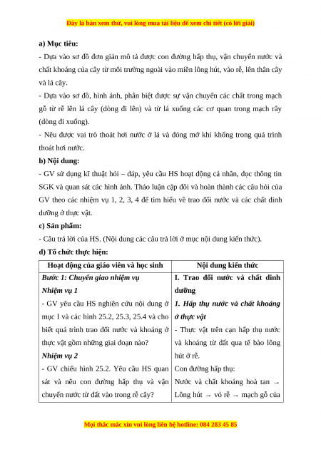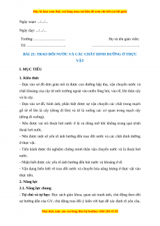 Giáo án Sinh học 7 Cánh diều Bài 25. Trao đổi nước và các chất dinh dưỡng ở thực vật