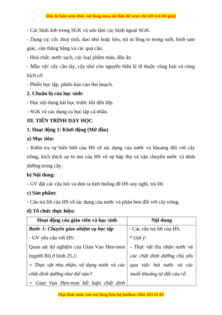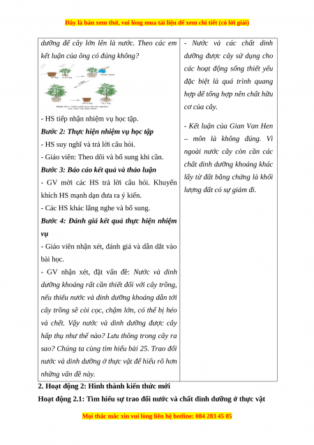 trồng, kích thích sự tò mò của HS về sự hấp thụ và vận chuyển nước và dinh dưỡng trong cây. b) Nội dung: