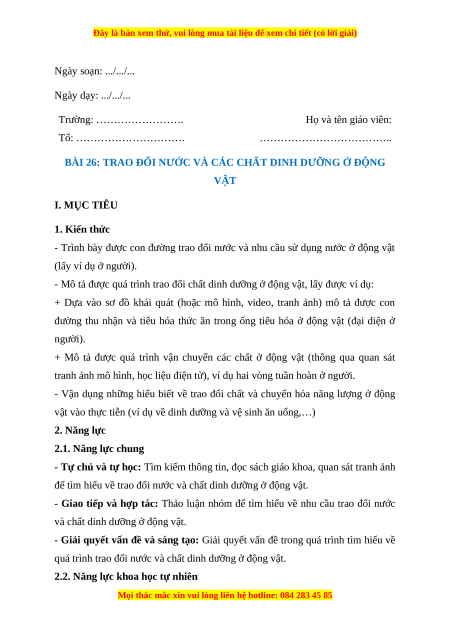 Giáo án Sinh học 7 Cánh diều Bài 26. Trao đổi nước và các chất dinh dưỡng ở động vật