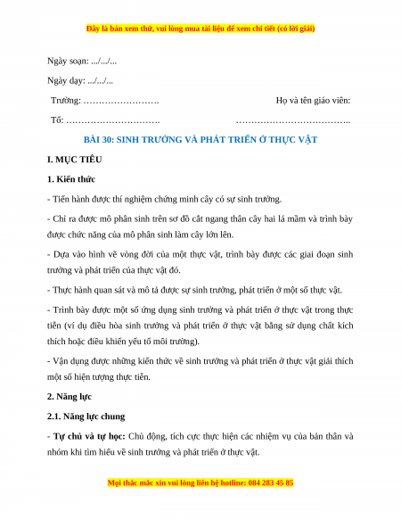 BÀI 30: SINH TRƯỞNG VÀ PHÁT TRIỂN Ở THỰC VẬT I. MỤC TIÊU 1. Kiến thức