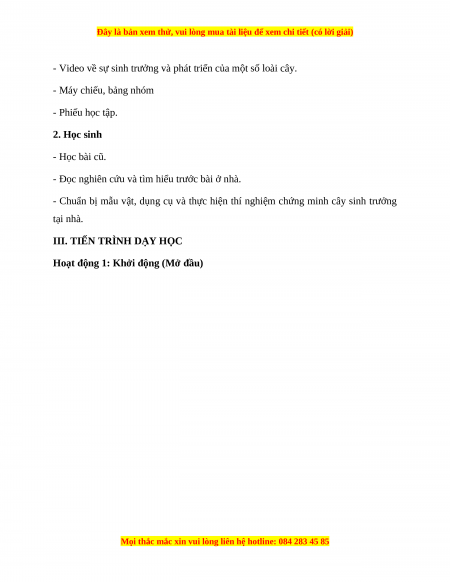 - Video về sự sinh trưởng và phát triển của một số loài cây. - Máy chiếu, bảng nhóm - Phiếu học tập. 2. Học sinh - Học bài cũ.