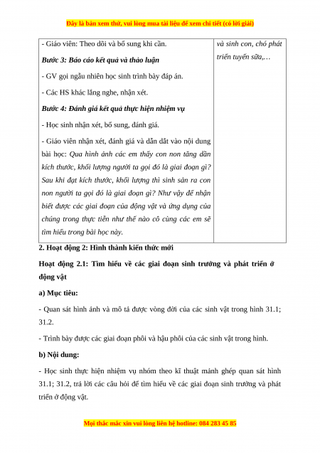 31.1; 31.2, trả lời các câu hỏi để tìm hiểu về các giai đoạn sinh trưởng và phát triển ở động vật.