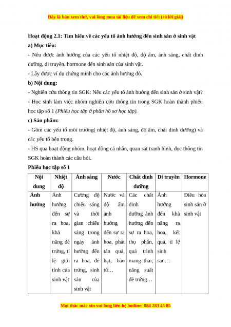 Hoạt động 2.1: Tìm hiểu về các yếu tố ảnh hưởng đến sinh sản ở sinh vật a) Mục tiêu: