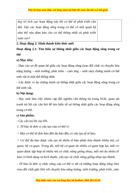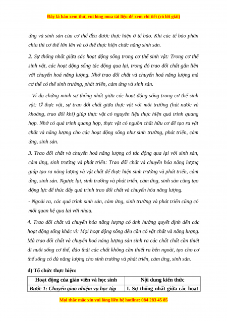 - Lấy được ví dụ chứng minh sự thống nhất giữa các hoạt động sống trong cơ thể sinh vật. b) Nội dung: