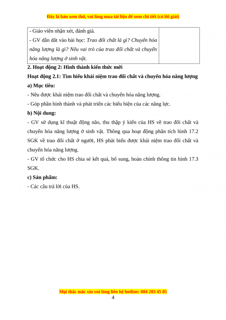 Hoạt động 2.1: Tìm hiểu khái niệm trao đổi chất và chuyển hóa năng lượng a) Mục tiêu: