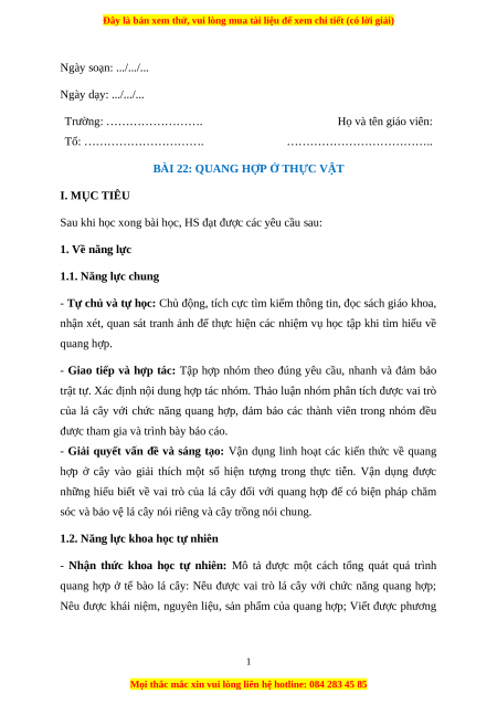 BÀI 22: QUANG HỢP Ở THỰC VẬT I. MỤC TIÊU