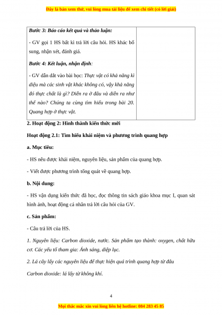 Hoạt động 2.1: Tìm hiểu khái niệm và phương trình quang hợp a. Mục tiêu: