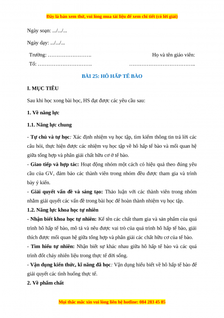Giáo án Sinh học 7 Kết nối tri thức Bài 25: Hô hấp tế bào