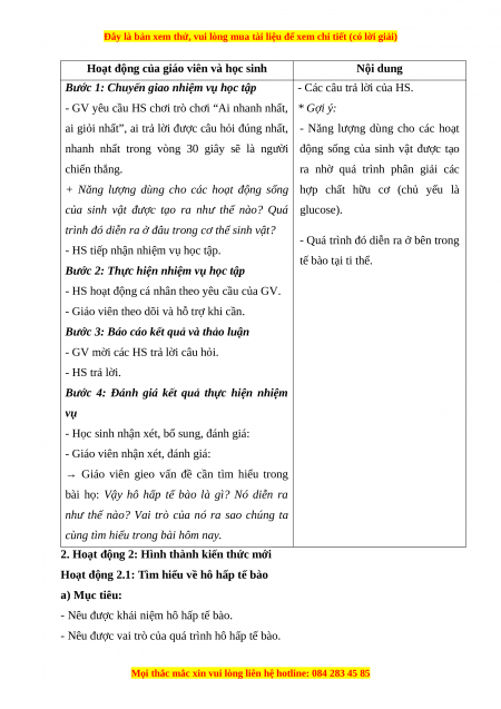 - Giúp học sinh xác định được vấn đề cần học tập: hô hấp tế bào. b) Nội dung: