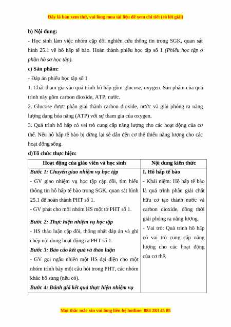 hình 25.1 về hô hấp tế bào. Hoàn thành phiếu học tập số 1 (Phiếu học tập ở