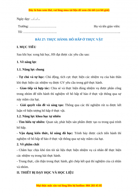 - HS hoàn thành được báo cáo thực hành hô hấp tế bào ở thực vật.