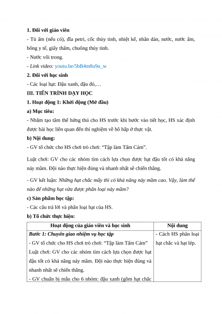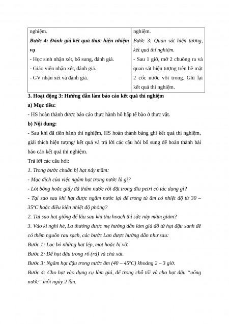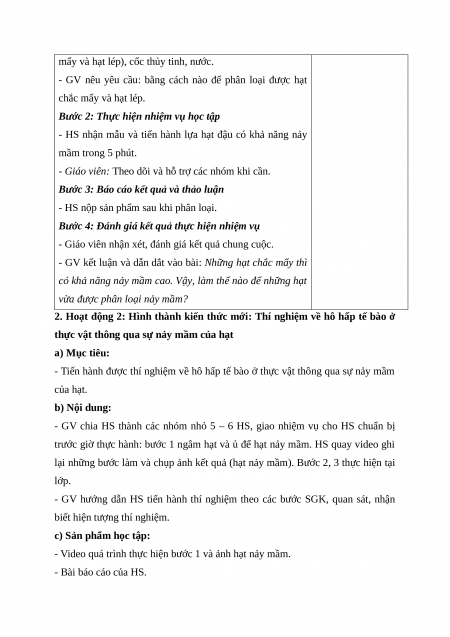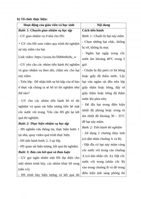 - Tiến hành được thí nghiệm về hô hấp tế bào ở thực vật thông qua sự nảy mầm của hạt. b) Nội dung:
