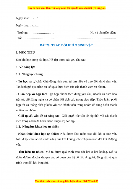 - Nhận thức khoa học tự nhiên: Nêu được khái niệm trao đổi khí ở sinh vật.