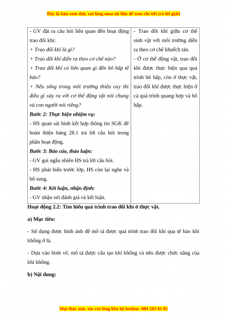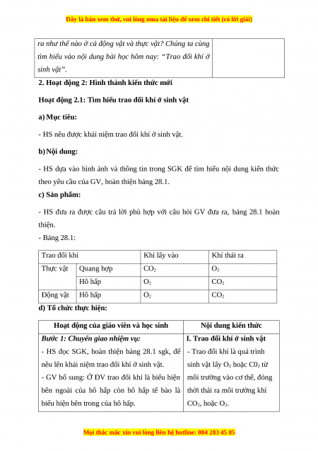 - HS đưa ra được câu trả lời phù hợp với câu hỏi GV đưa ra, bảng 28.1 hoàn thiện. - Bảng 28.1: Trao đổi khí Khí lấy vào Khí thải ra Thực vật Quang hợp CO2 O2 Hô hấp O2 CO2 Động vật Hô hấp O2 CO2
