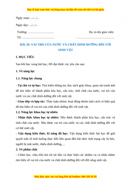 BÀI 29: VAI TRÒ CỦA NƯỚC VÀ CHẤT DINH DƯỠNG ĐỐI VỚI SINH VẬT I. MỤC TIÊU
