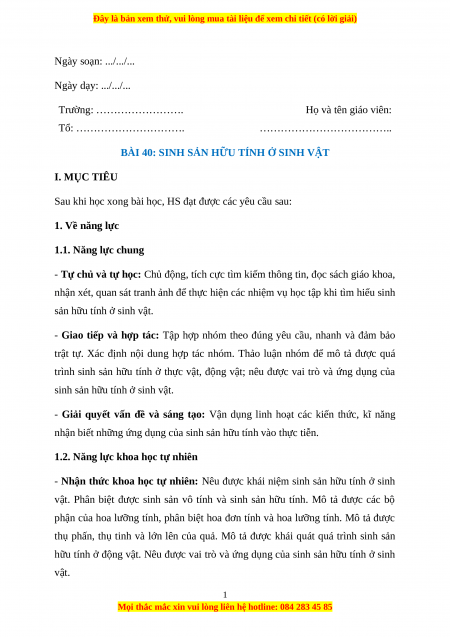 BÀI 40: SINH SẢN HỮU TÍNH Ở SINH VẬT I. MỤC TIÊU