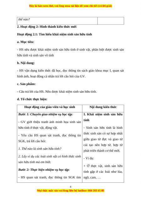 Hoạt động 2.1: Tìm hiểu khái niệm sinh sản hữu tính a. Mục tiêu: