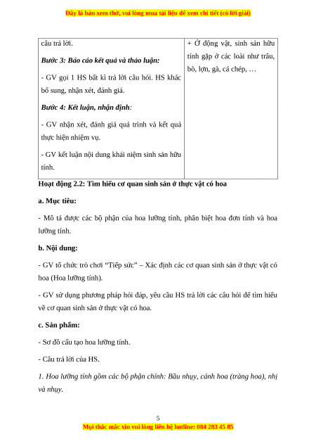 - Mô tả được các bộ phận của hoa lưỡng tính, phân biệt hoa đơn tính và hoa